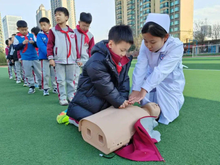 师生移步操场,在志愿者一对一的指导下,孩子们分组进行模拟练习。在“海姆立克”区域,孩子们两两一组,练习了背后环抱、定位冲击的动作,志愿者在旁细致调整他们的手势与力度。在“心肺复苏”区域,孩子们轮番上阵,认真练习着胸外按压。“01、02、03……”稚嫩而坚定的计数声在操场上回荡。操场变成了急救教育实践基地,现场气氛热闹非凡,求知与实践的热情驱散了初冬的微寒。